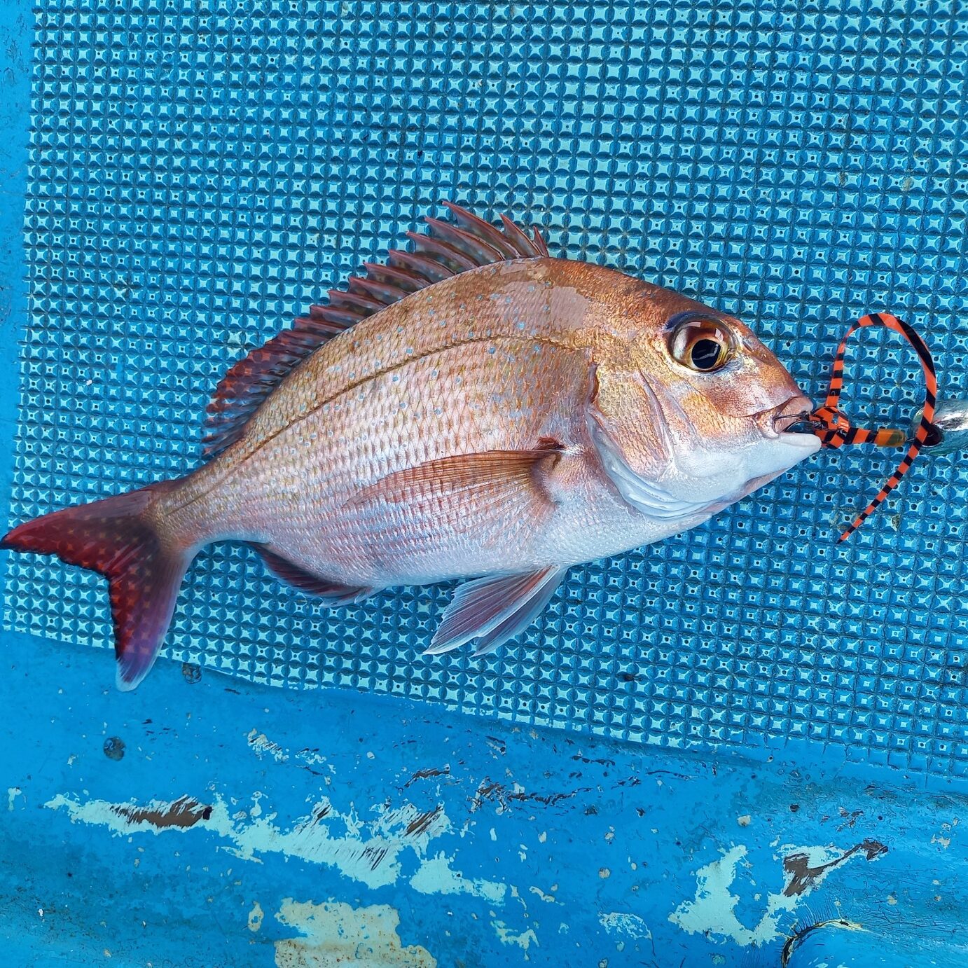 その後はまた修行タイムでネクタイを鯛龍の80,100、120、マスターカーリー、ミディアム、ストロングと色々変えていきますがアタリが出ないので、普段あまり使わないファインフィネスのブライトオレンジゼブラに替えスピニングでキャストに切り替えると着底後3巻き目で違和感!そのまま5巻きほどついてきてやっと反転!軽く合わせを入れて巻きに掛かりますがドラグを出すほどでもなく。。上がってきたのは塩焼きサイズで元気だったのでそのままリリース。とりあえずボー〇は免れました(笑)