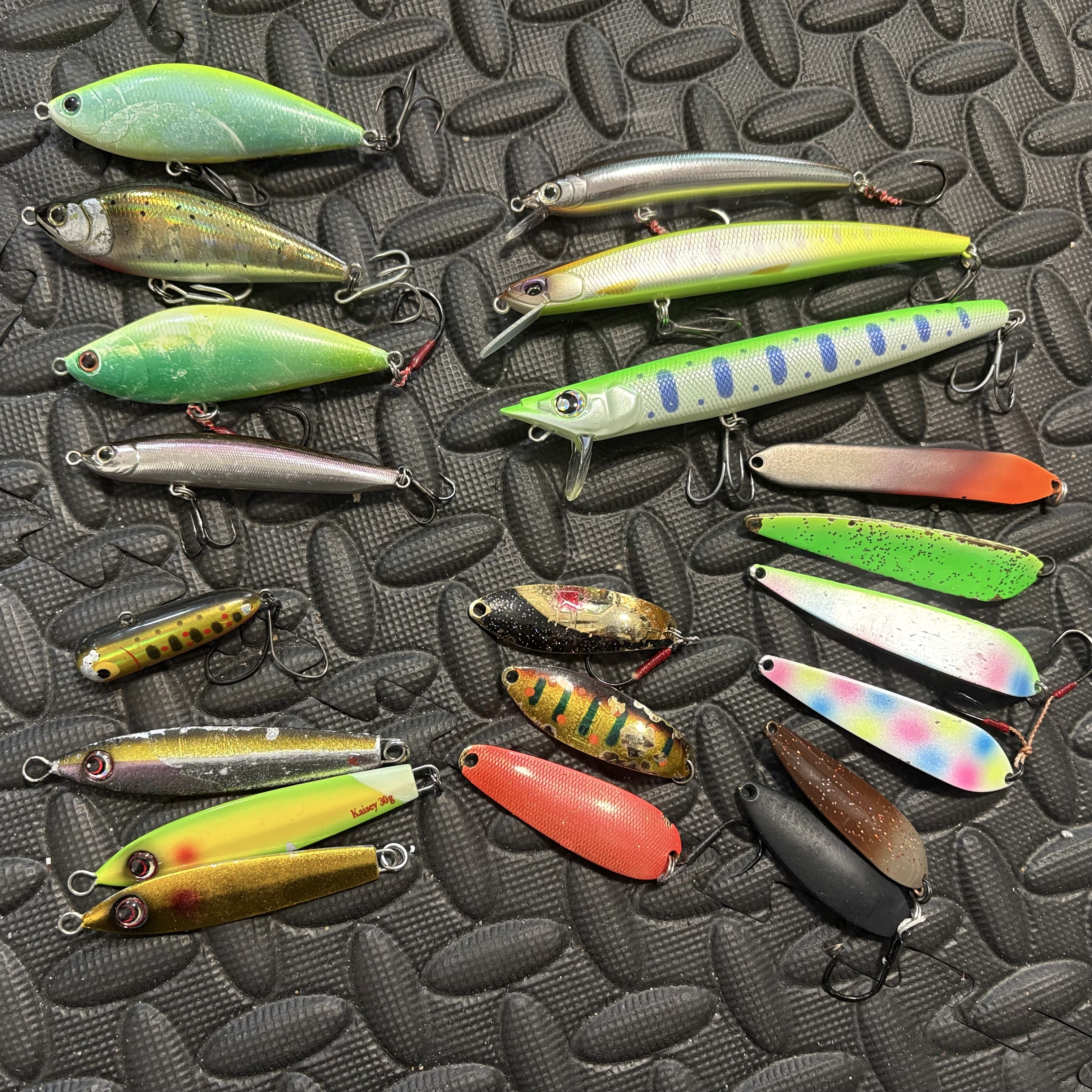 - シンキングシャッド70、70HS、MTボルツ130、MTレイクス16~19g、ノアG8~14g、政影スリム120F、パニッシュ85F、ヘブン13g、トラウティンサージャー、チェリーブラッド70ドリフト、ボトムノックスイマー41、海晴レイクスペシャル18~30g、メッシュバイト10g、バックス8~11g、プロビア18g、モーダグラマー18g