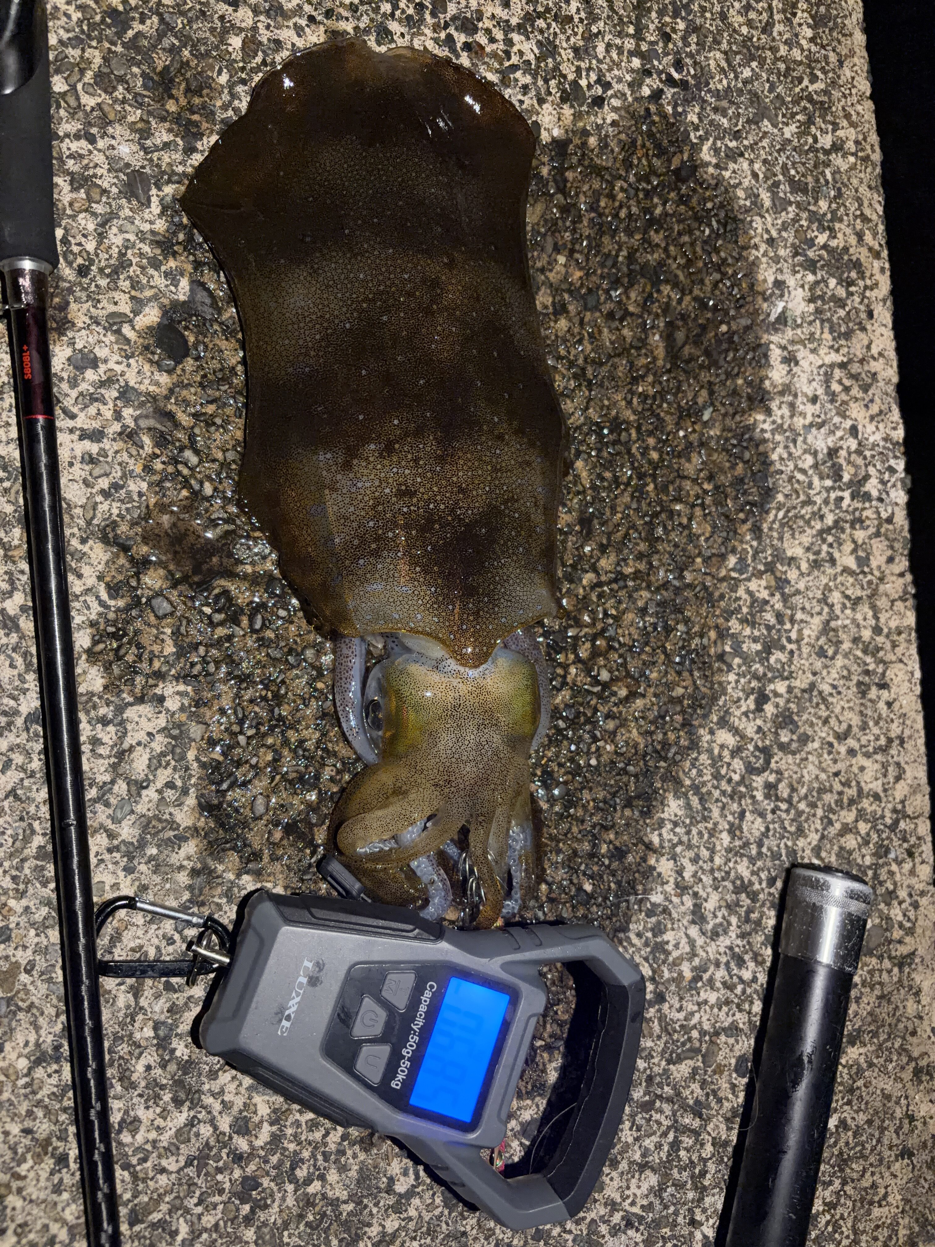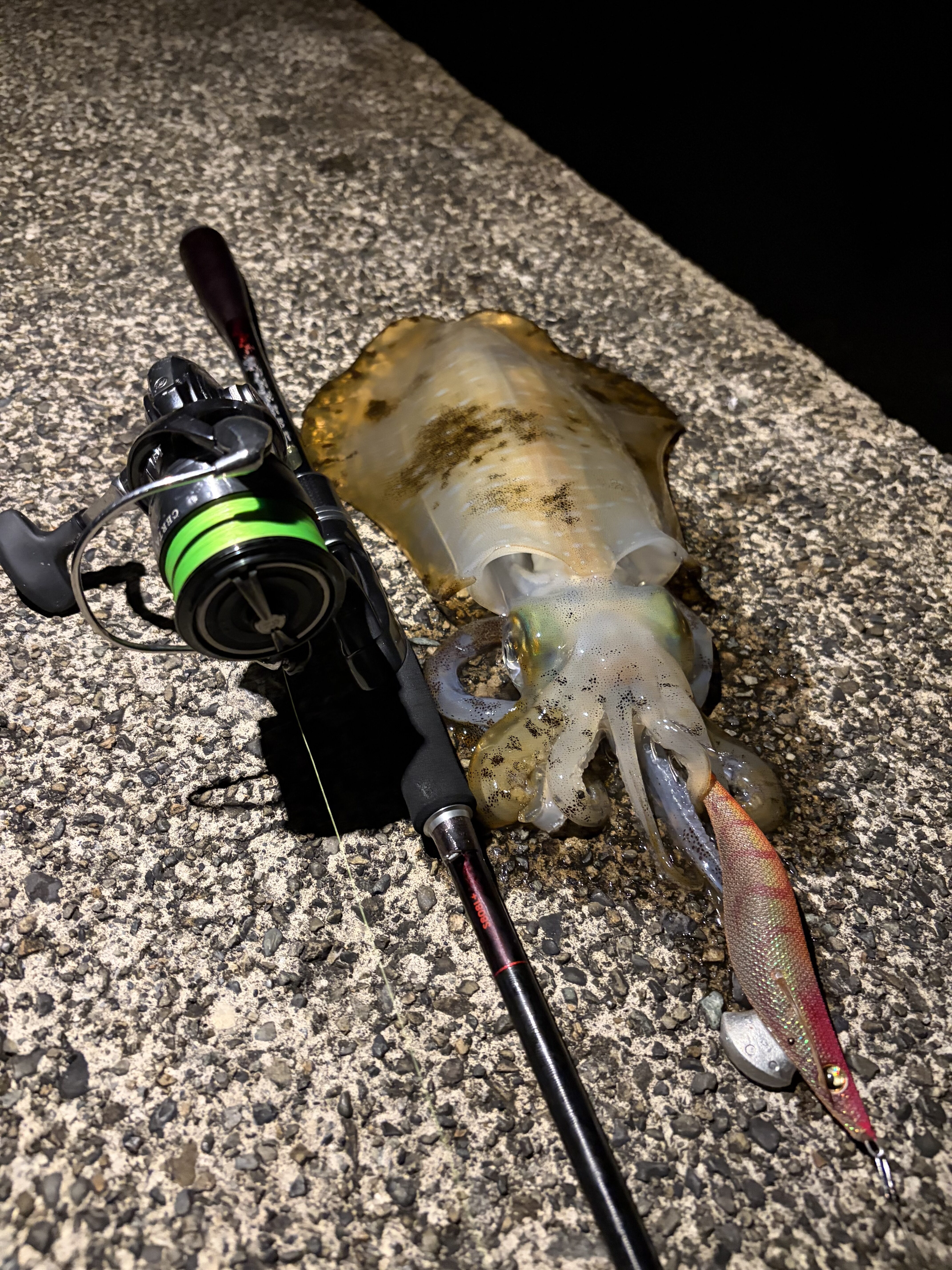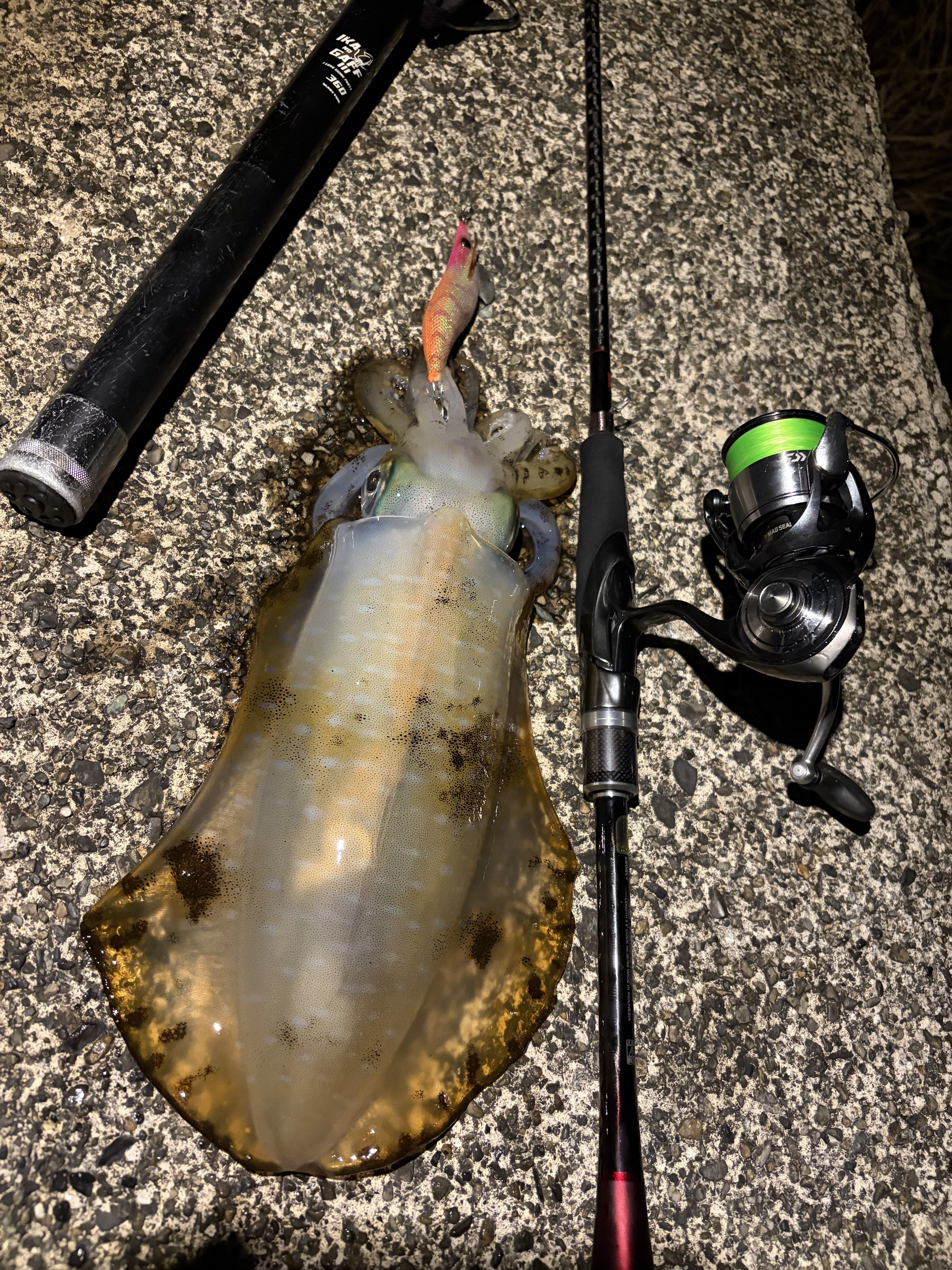 2026.04.07 印刷する 伊豆春イカエギング 魚種 アオリイカ 数 アオリイカ685g 釣り方 ☆エギング 場所 静岡県 スタッフ 今中颯 店舗 イオン相模原店 釣行日 2026.04.01 コメント お疲れ様です。相模原店今中です。 今回は仕事終わりに春イカ狙いのナイトエギングに行ってきました。 潮通しが良いポイントに目星があったので、深夜1時過ぎにエントリー ポイントがテトラ帯でしたので磯靴で釣りをしました。 ポイントはかなり広いところでしたので、一投毎に歩いて打つランガンスタイル それでも2時間程投げ続けましたが反応は得られず。 丁度、テトラの向きが真っ直ぐから斜めになっているところがあり、ワンドになっていたので そこに投入して、底をとり、シャクリからのテンションフォールをすると… ヒット‼️ 波ではない違和感のようなアタりでした アオリイカが掛かった時のドラグ音はやはり癖になりますね 上がってきたのは685gでした🦑 潮は流れていたのでワンドに居着いていた個体かなと思います。 ヒットエギは、エギ王ライブ3.5号オラオラマンゴー エギ王はKがよく使われますが、ナイトゲームだとアピールKよりあるライブの方が良い場合もあるので是非使ってみてください😊 使用した釣具 ロッド 17セフィアエクスチューン808L+ リール 24セルテートLT2500 エギ エギ王ライブ3.5号オラオラマンゴー
