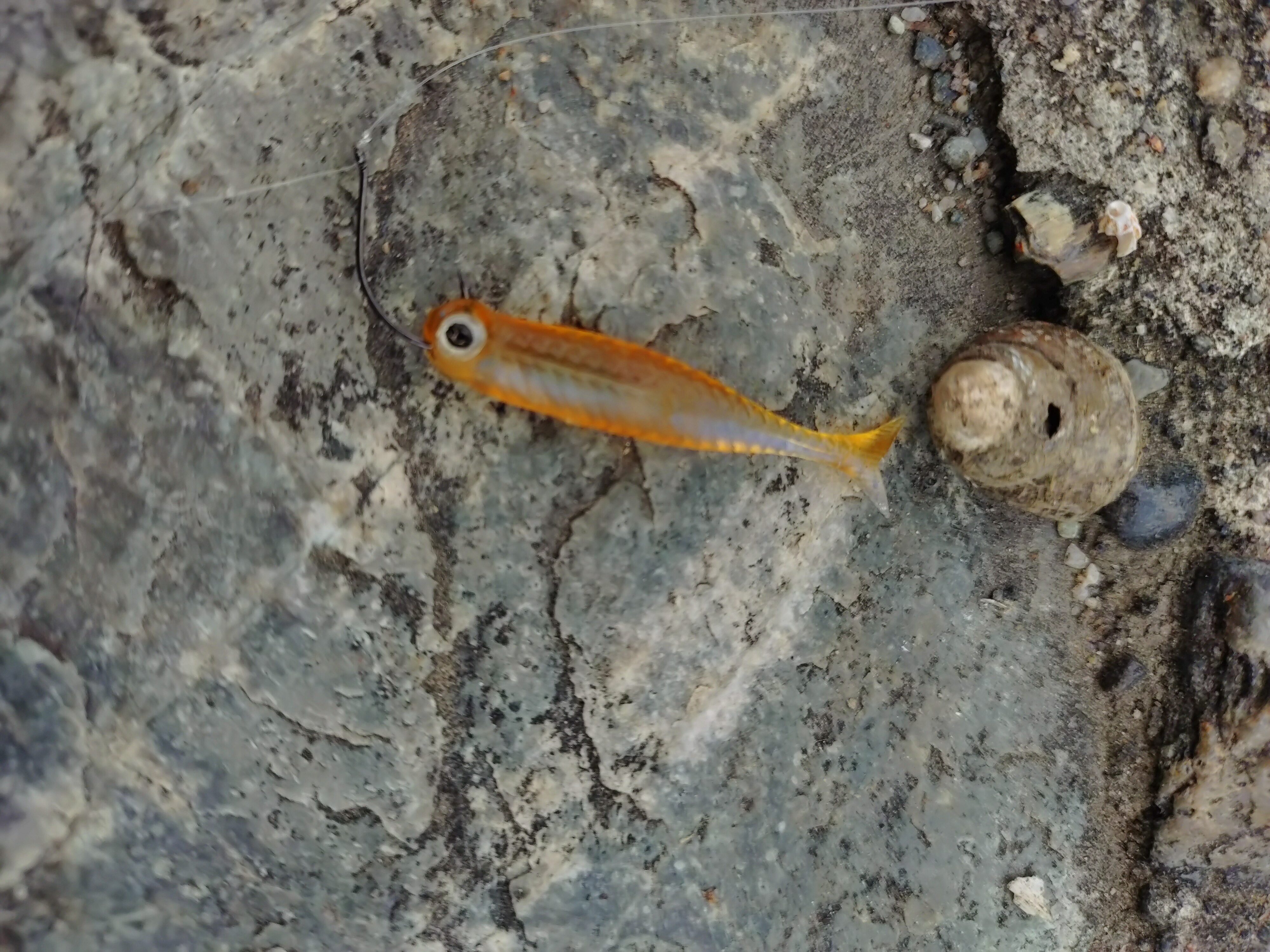 そして折り返し、上流側から下流に向かって歩いていると、小魚が一瞬何かに追われて逃げる姿が見え、その近辺にディスタイルのヴィローラマイクロ1.8gダウンショットリグを投げると、直ぐ様ラインが走り、30アップをキャッチ出来ました(〃∇〃)