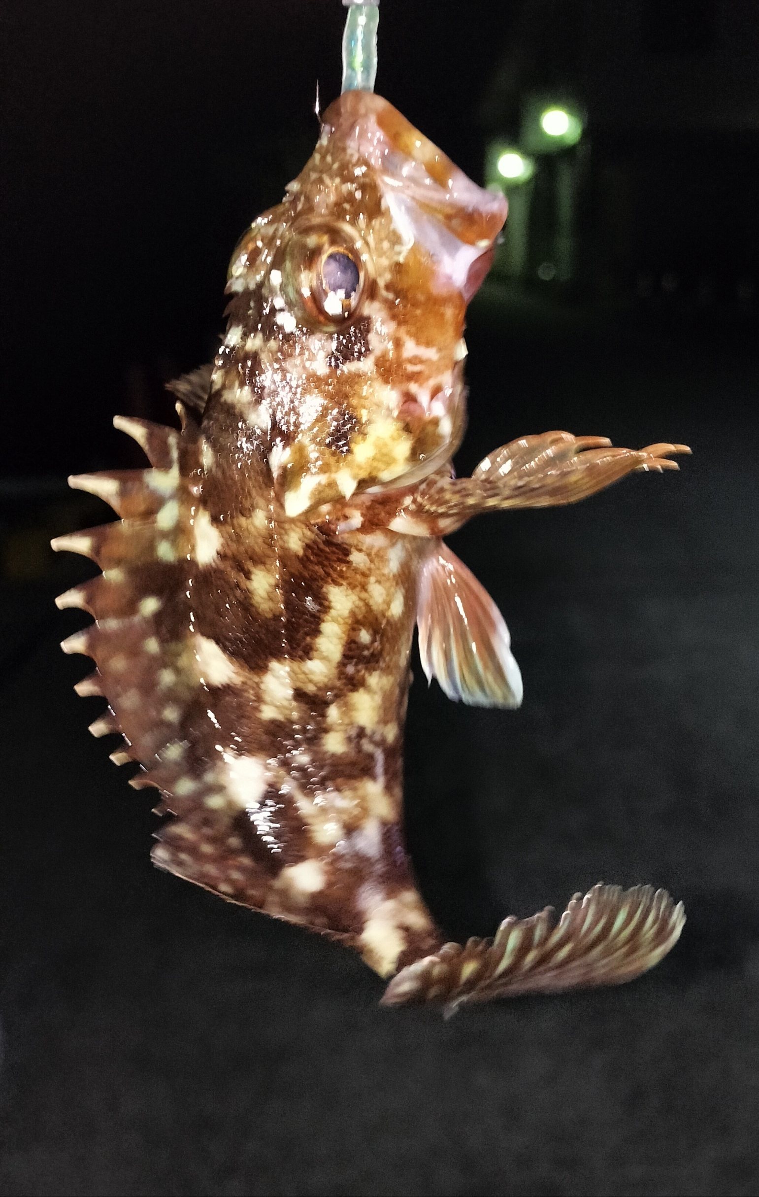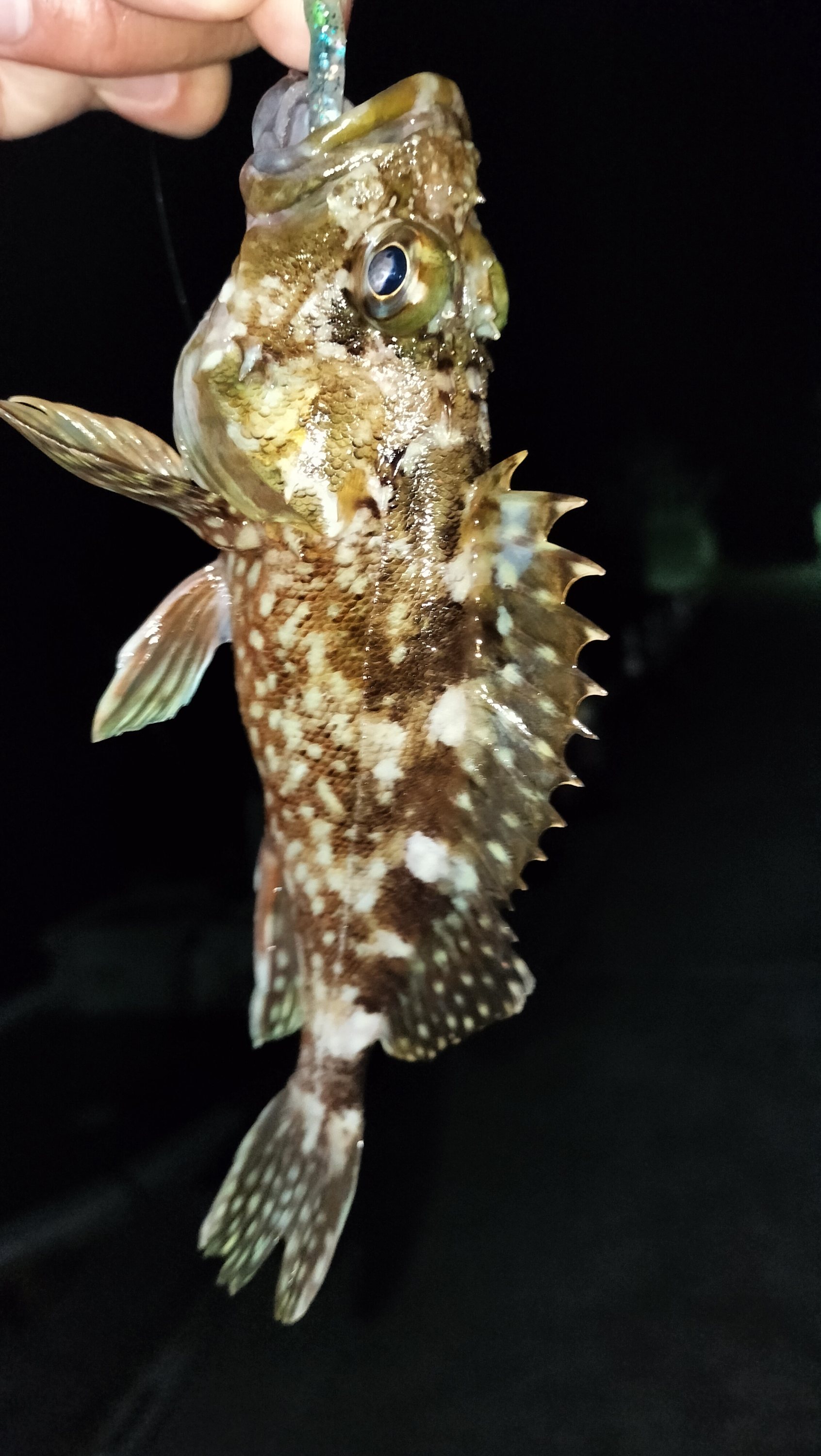 次に外灯の光が映る明暗の境目を探るも反応無し。やはりベイトが居ないと厳しそうだと思いながら岸壁寄りを通すと予想していたアタリが出て18センチくらいのカサゴをキャッチ!!