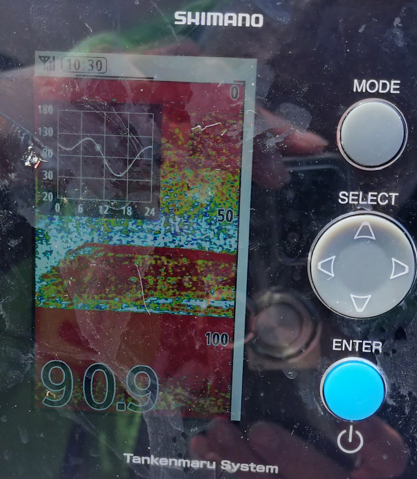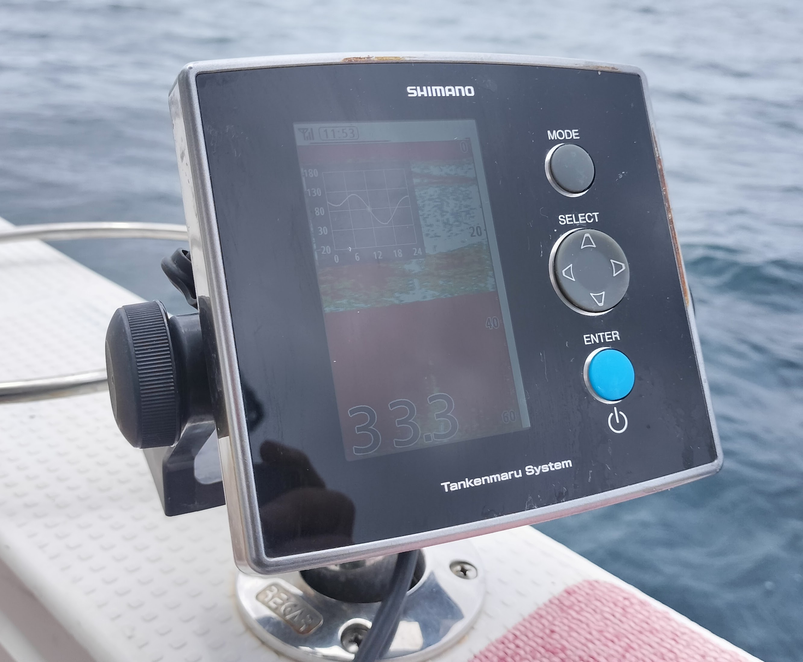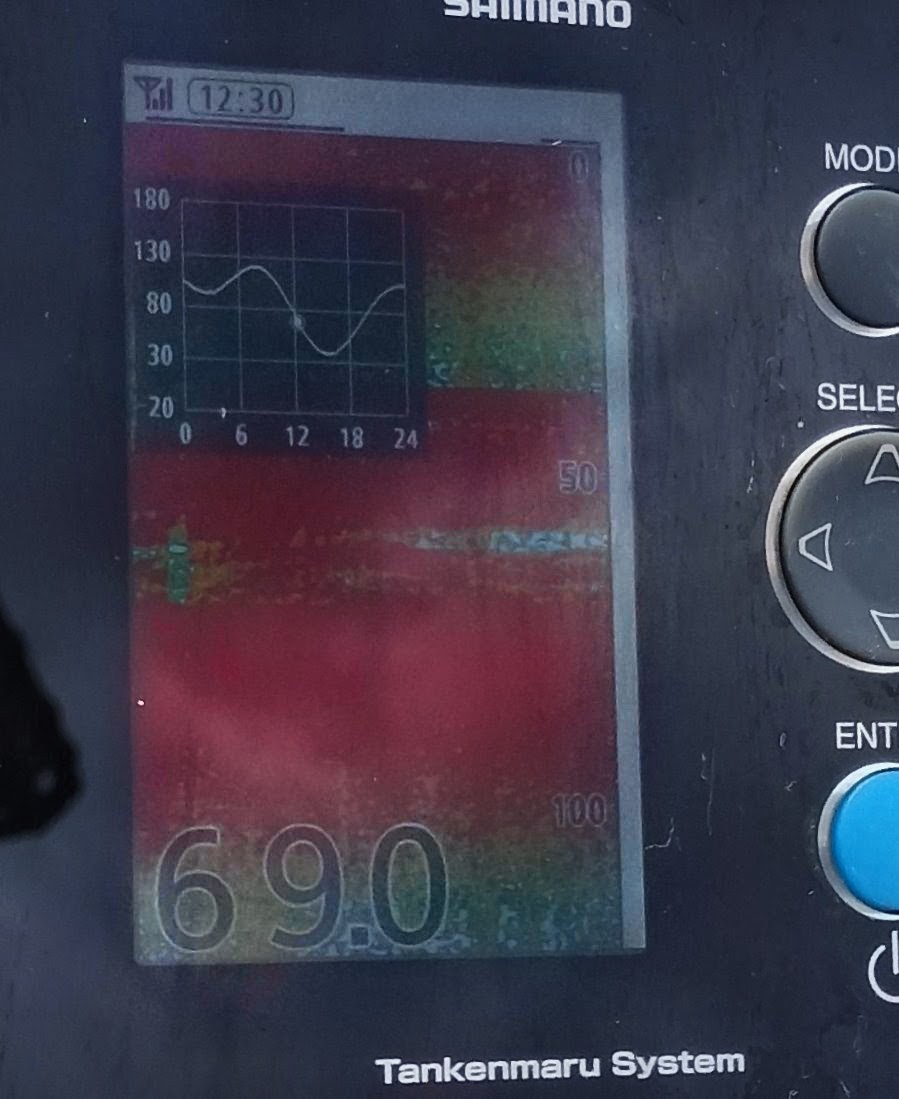 このポイントではマダイがコマセを捕食しており、探見丸にも上下動している様が見受けられて反応の通り左舷トモ氏がキロ弱をゲット!!