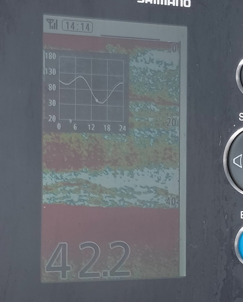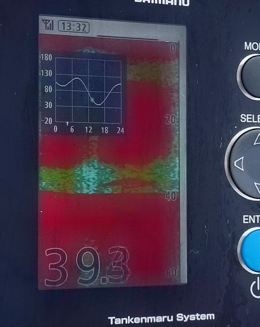 本来は乗っ込みの最有力ポイントもマダイはコマセを捕食せずに隣接する30〜40mダチに移動。