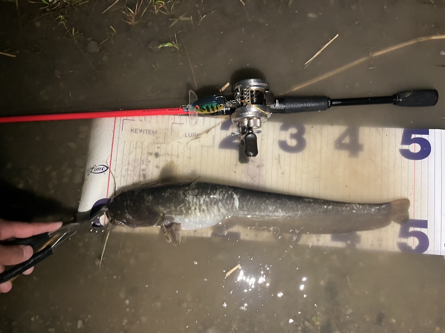 2026.04.16 印刷する オフショアアングラーが行くナマズトップゲーム④ 魚種 ナマズ 数 ナマズ 釣り方 ☆ナマズ 場所 埼玉県 スタッフ 越野光希 店舗 柏店 釣行日 2026.04.15 コメント こんにちは!柏店SW担当の越野光希です!今回は昨日のリベンジを果たすべく雨の中ナマズトップゲームを頑張ってまいりました!今回の先発は完璧にチューニングしたバトラクスです!今回は雨なので上流に行きました!開始数投目からバイト、バイト、バイト!!しかし乗らなかったり抜き上げでフックアウト、、20バイト目のその時、岸際をシェイクしながら誘うと、、、 バコ!!!!出ました!!無事抜きあげることができナイスサイズのナマズが釣れました!!!!その後もう一発乗ったと思ったらまさかのカエルさん、、、(ごめんよ)今回の釣行で分かったのは、フックをシングルフックに変えてみようと思ったことです!次回はバラシ軽減のためシングルフックで挑んでみようと思います!個人的には、ダブルくトレブルくシングルな気がします!シングルフックの使用感も次回のレポートに書けたらなと思いますのでまた次のレポートでお会いしましょう!最後までご視聴いただきありがとうございました!越野でした! 使用した釣具 ロッド BPMC61M-2 リール カルカッタコンクエストDC101 ルアー バトラクス