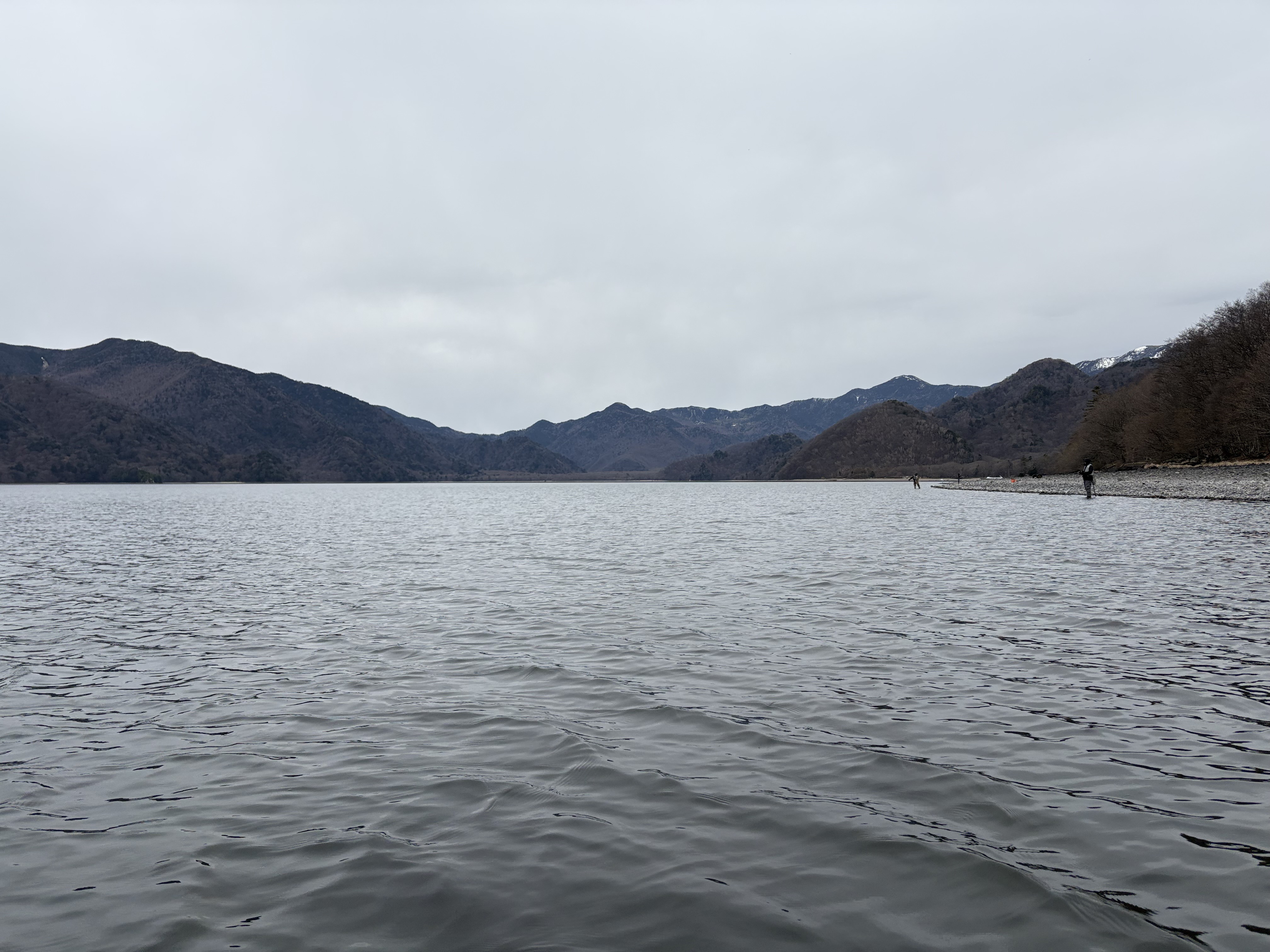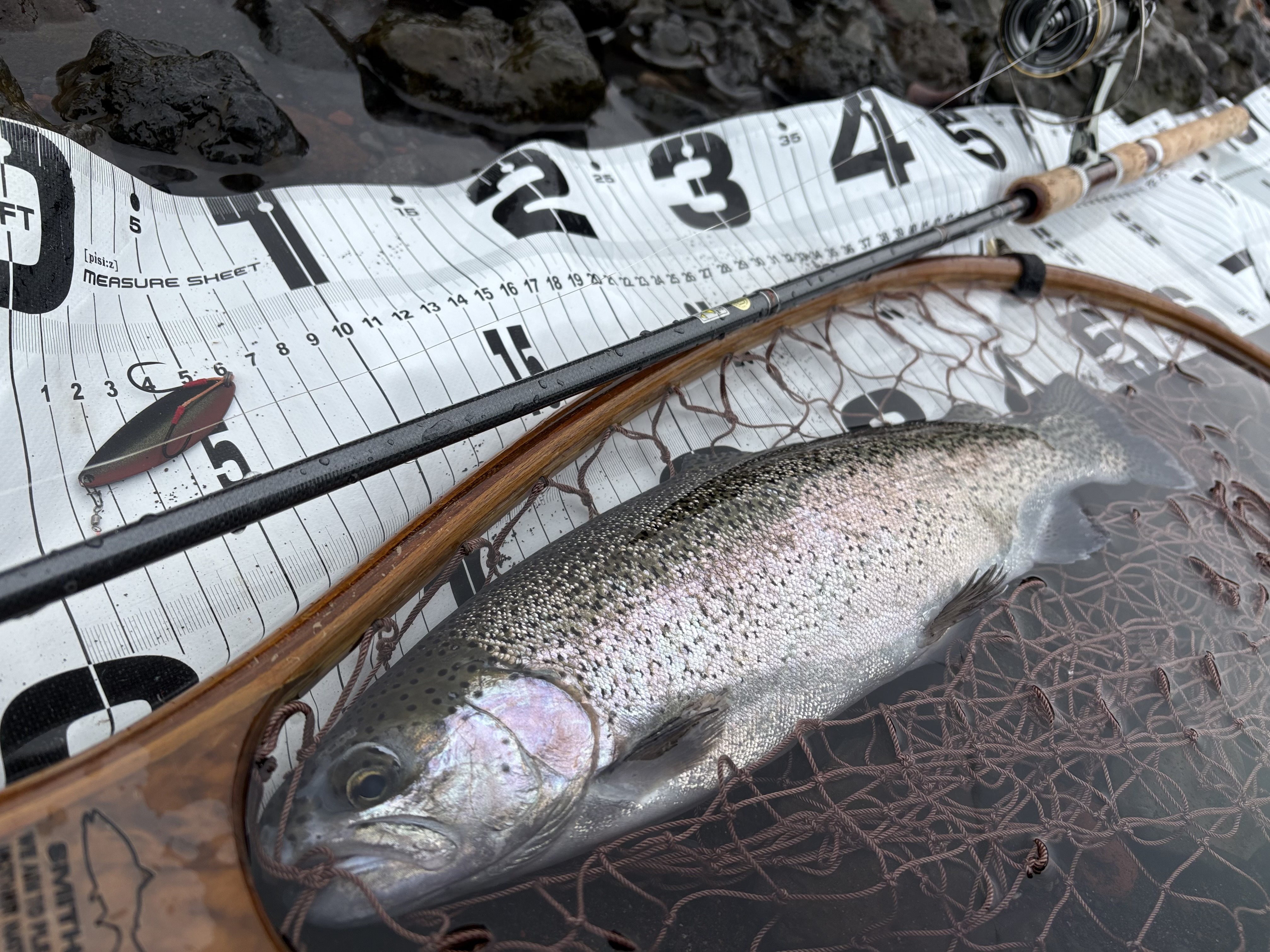 一人残された僕は焦りつつも坊主逃れに表層のニジマスを狙うが2バイトのみ、ボトムもスプーンを形、重さ、色を変えていろいろ探る