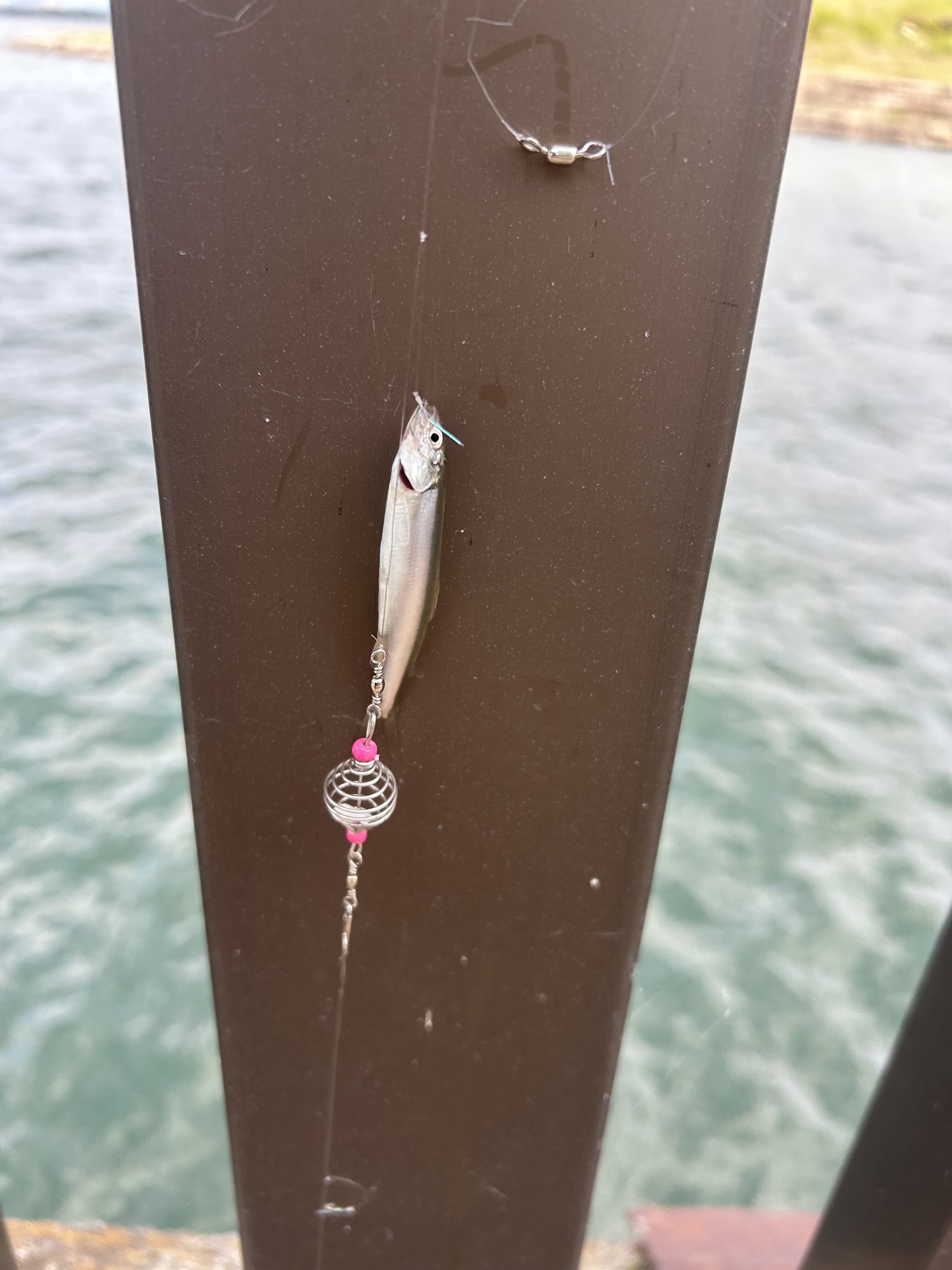 ポイントは取り付けた生シラスだんごの煙幕に仕掛けを同調させることで、海のサビキ釣りによく似ています。