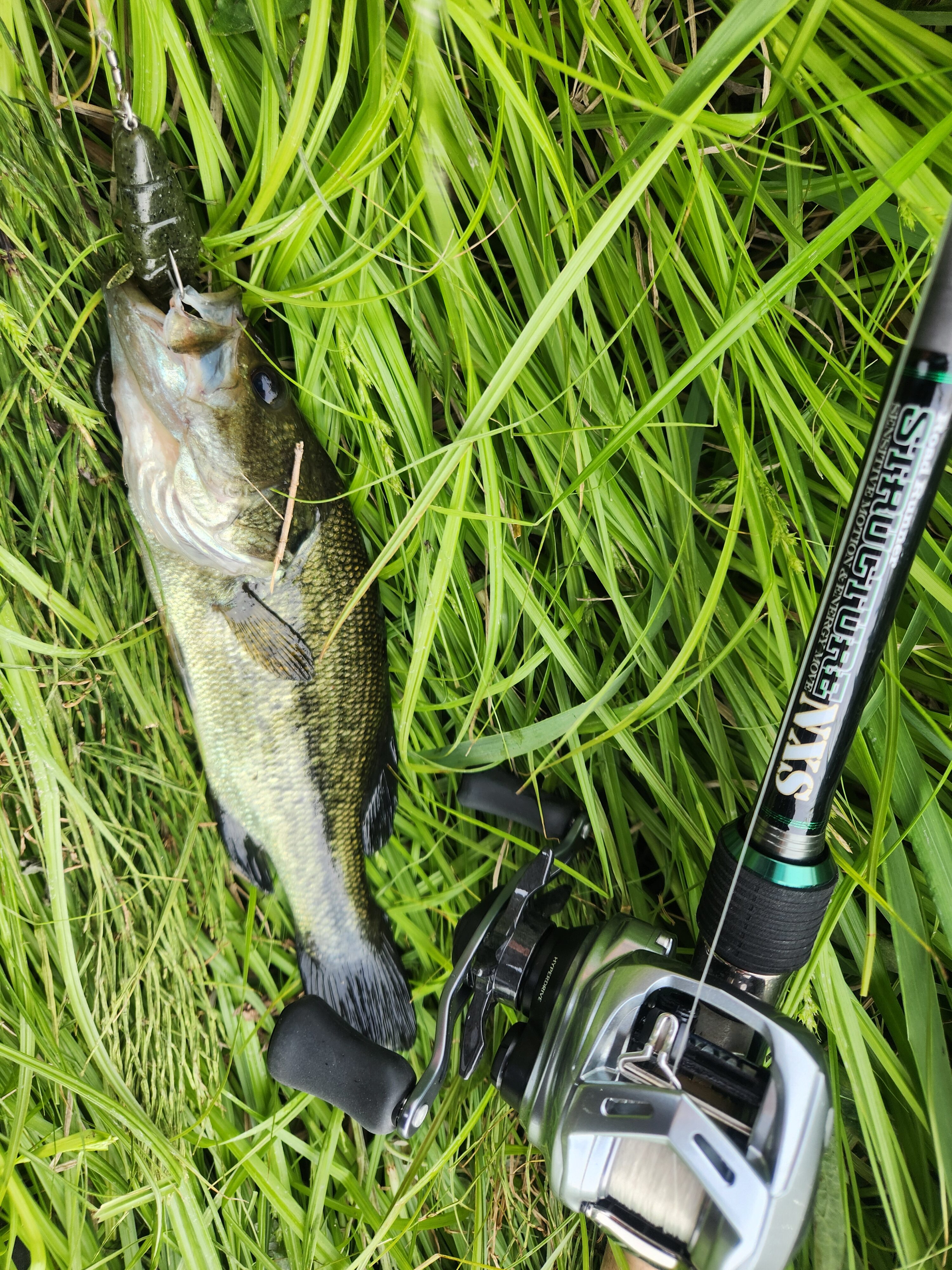 ドライブビーバーの5g直リグでアシの根本めがけて丁寧に打っていきます。