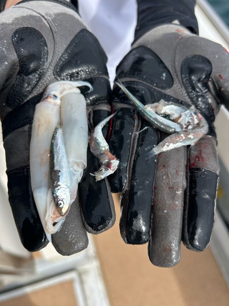メインベイトは5cmほどのカタクチイワシと小さなスルメイカ。魚はものすごい量がいるのに食わすのは中々難しいわけですね😅