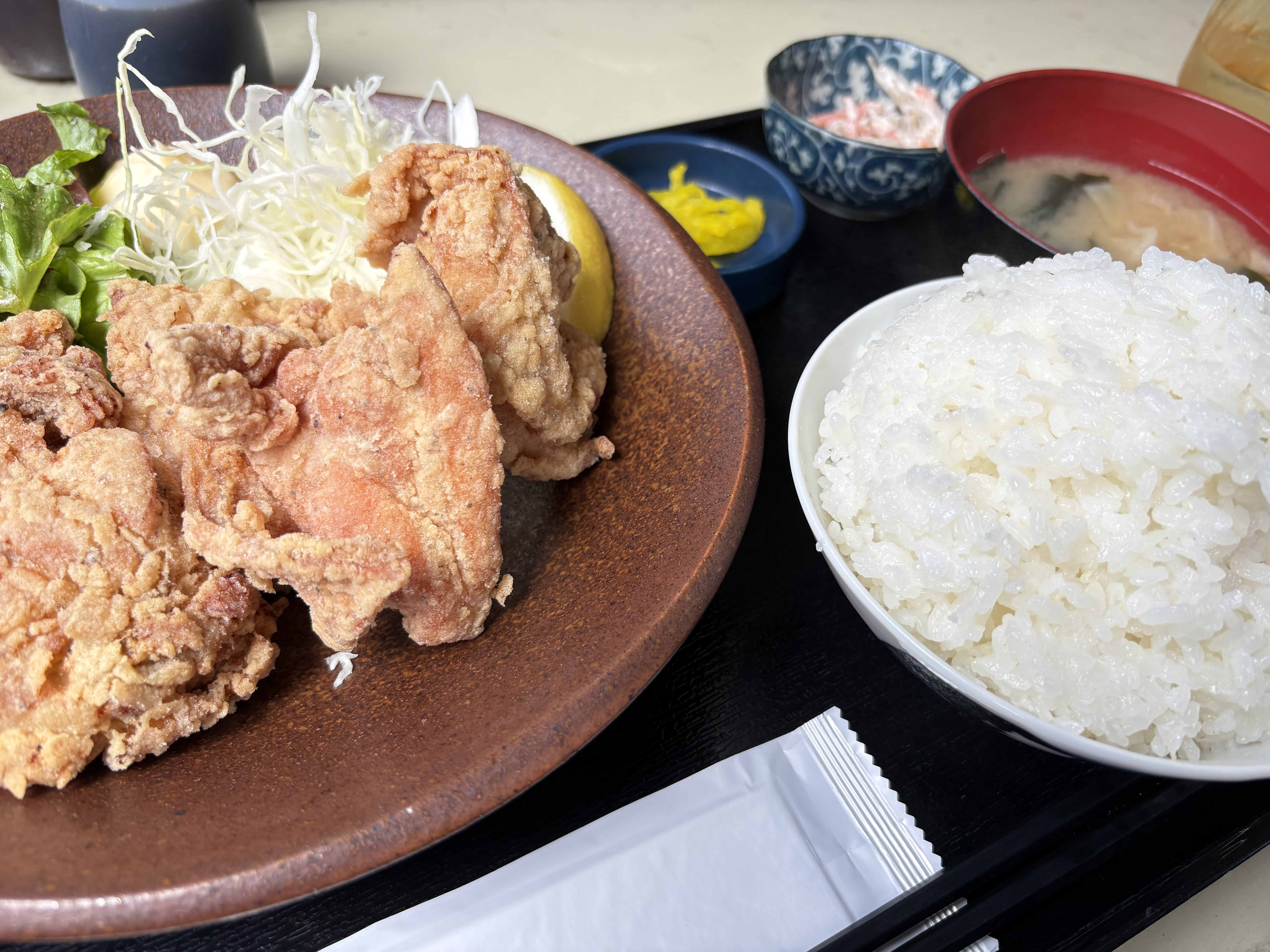 お昼休憩はお馴染みのから揚げ定食!