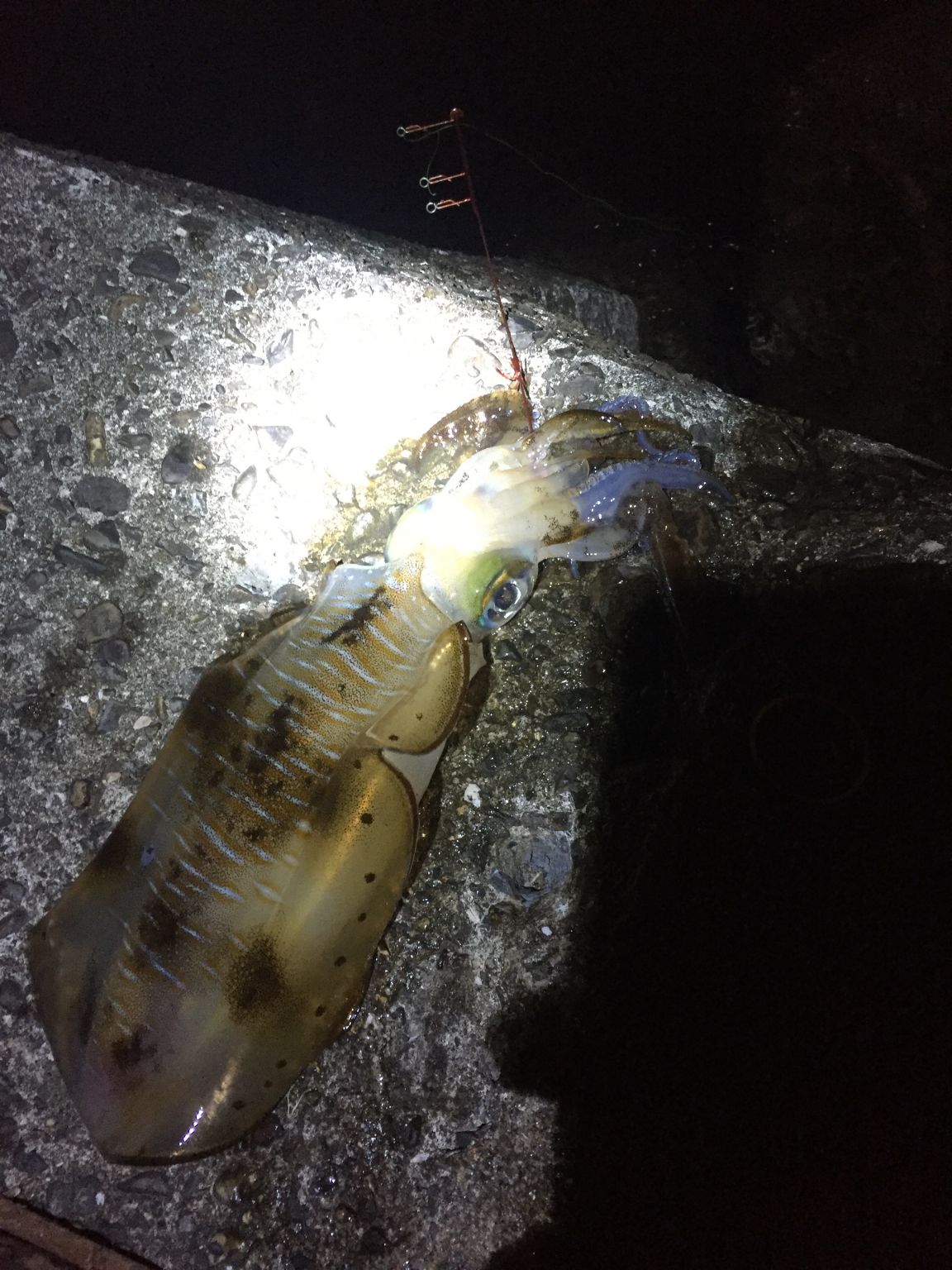 人も居ないし、ポイント貸し切り。寂しくヤエンとエギングしながら夕まずめあたりもなく終わり辺りが真っ暗。潮も動きだし、アジを投げ直しエギングをしようとしたらオチパクでアジを抱いてドラグがジリジリ鳴り響く。このドラグがたまらないですよねー。 ドキドキしながら慎重にイカを寄せてすぐにヤエン投入。なんとかイカが乗りキャッチしました!小さいですが貴重な一杯