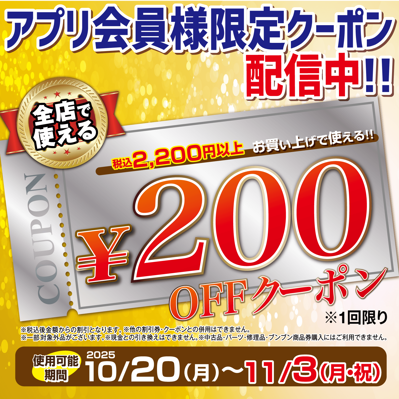 【全店】アプリ会員様限定 200円OFFクーポン!