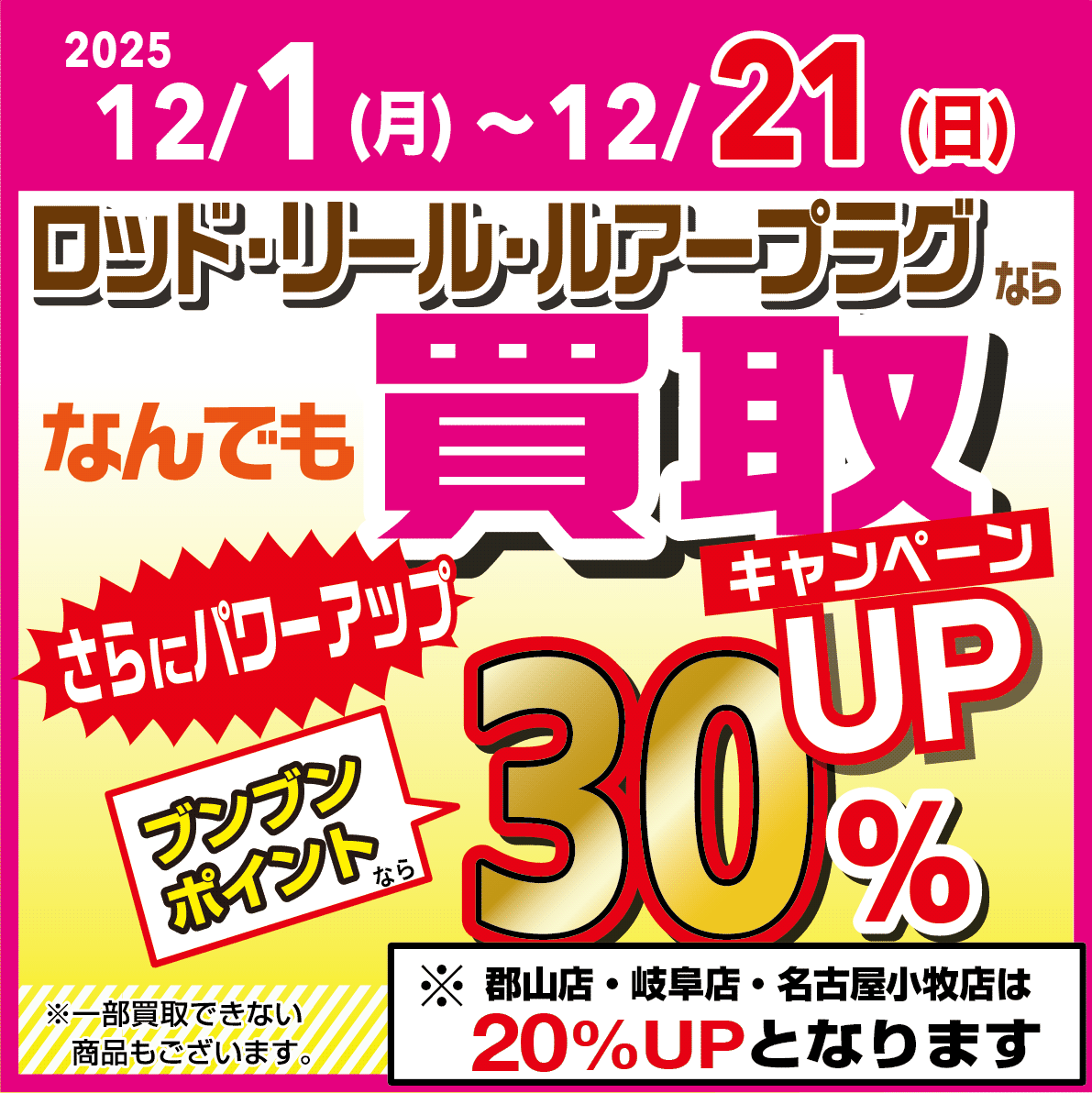 セール情報 2025.12.01 ~ 2025.12.21 イオン相模原店 リンクスウメダ店 京都 伏見店 厚木店 埼玉狭山店 堺店 大津店 川崎大師店 柏店 西昆陽店 高井田店 高槻店 ロッド・リール・ルアープラグならなんでも買取30%UP!