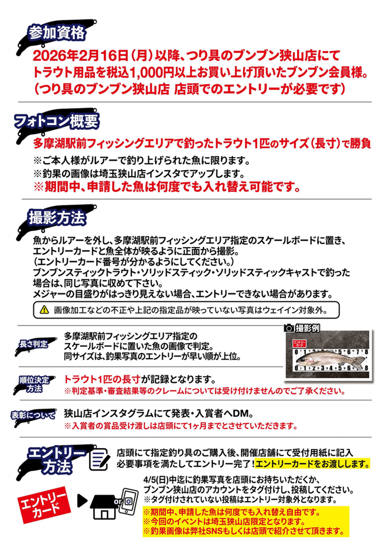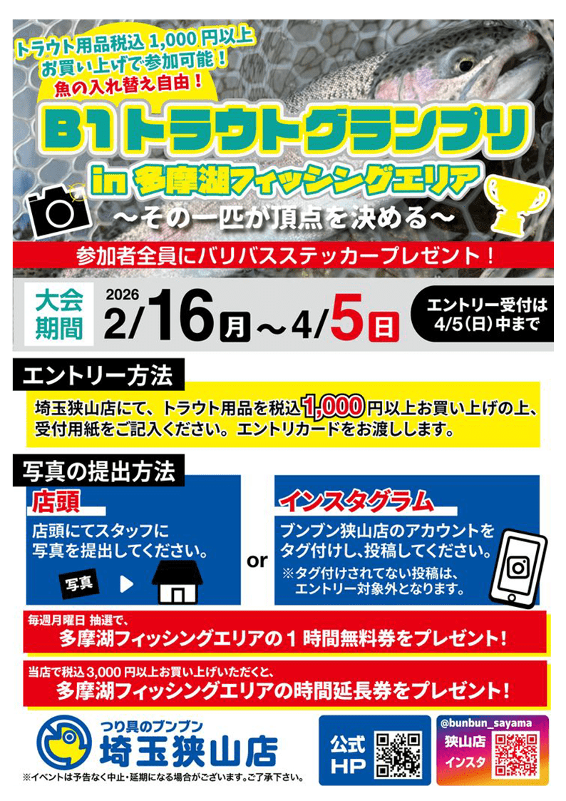 イベント情報 2026.02.16 ~ 2026.04.05 埼玉狭山店 【埼玉狭山店】B1トラウトグランプリin多摩湖フィッシングエリア ■埼玉狭山店店舗情報はこちら☟ 埼玉狭山店 ■埼玉狭山店公式Instagramはこちらをタップ☜