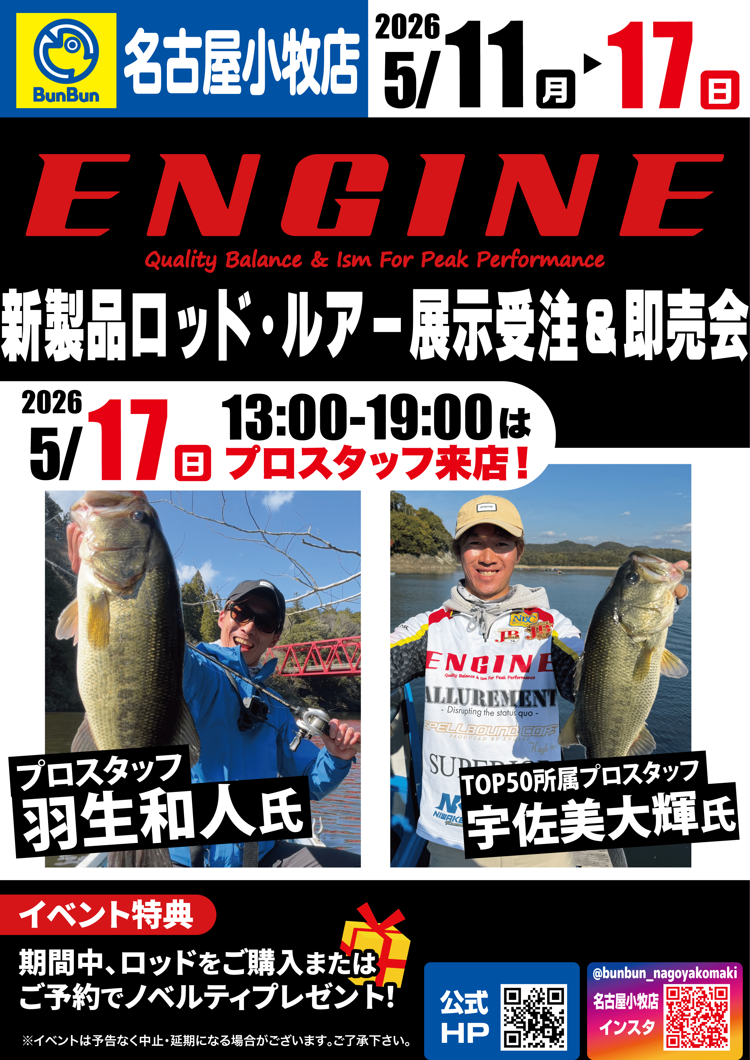 イベント情報 2026.05.11 ~ 2026.05.17 名古屋小牧店 【名古屋小牧店】ENGINE新製品ロッド・ルアー展示受注&即売会! ■名古屋小牧店店舗情報はこちら☟ 名古屋小牧店 ■名古屋小牧店公式Instagramはこちらをタップ☜