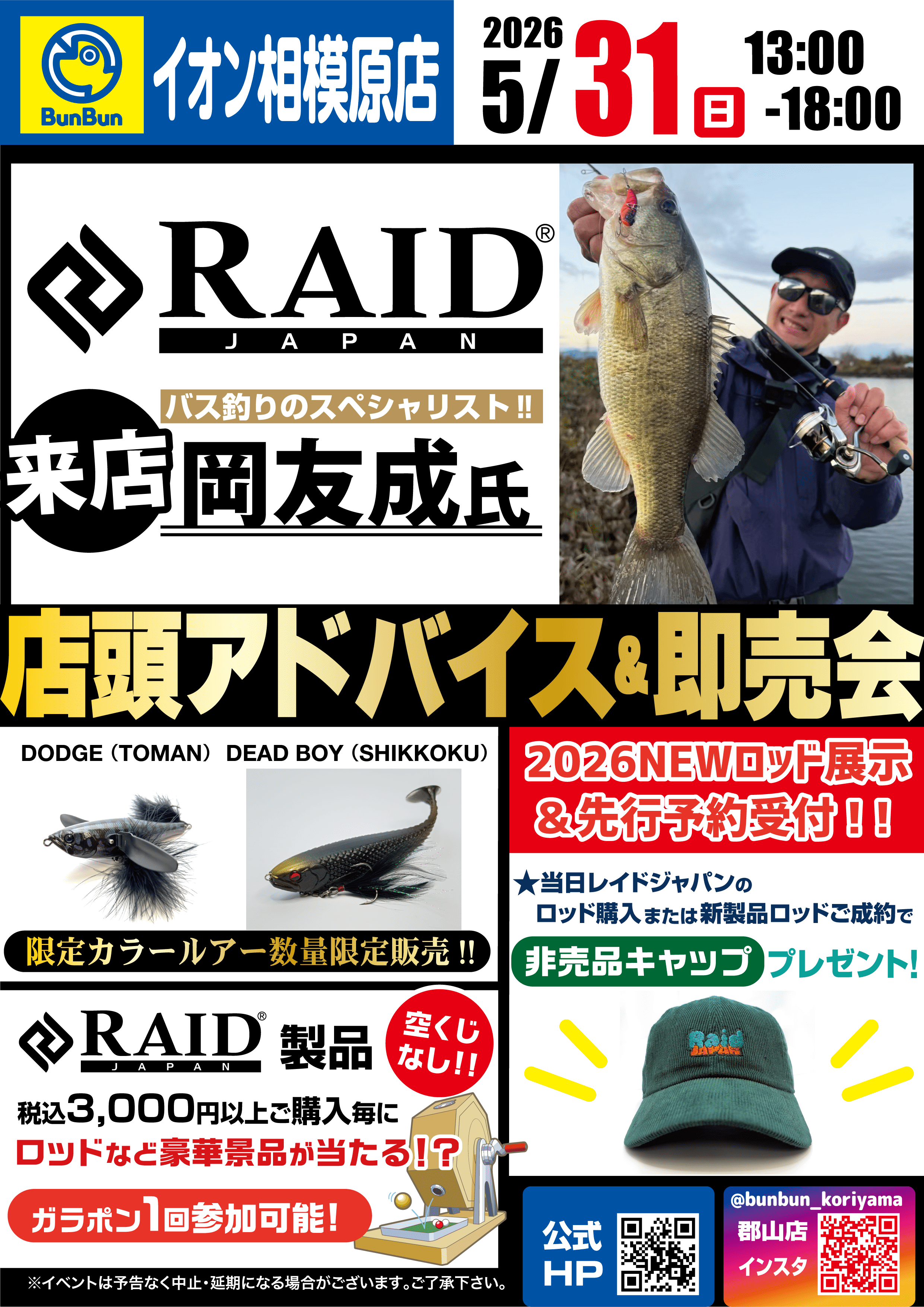 イベント情報 2026.05.31 イオン相模原店 【イオン相模原店】レイドジャパン 店頭アドバイス&即売会! ■イオン相模原店店舗情報はこちら☟ イオン相模原店 ■相模原店公式Instagramはこちらをタップ☜